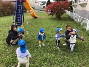 ふたば組はおやつの入ったお弁当バックを持ってにこにこ公園へ🎵おやつをあっという間に食べてしゃぼん玉やわらべうたを楽しみましたよ✨