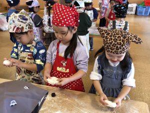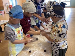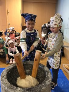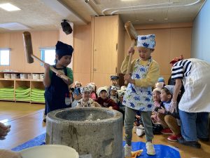 どんぐり組は初めてのおもちつき、「よいしょ~!」の掛け声で元気いっぱいお餅をついてくれました🤭