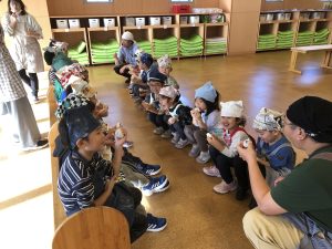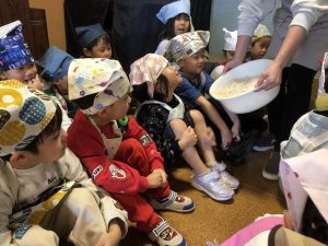 12月16日(火)におもちつきを行いました!幼児組3クラスが順番にもりのホールに行き、一人ひとりもちつき体験!!出来立てのあんこもちをみんなで食べましたよ😋