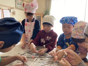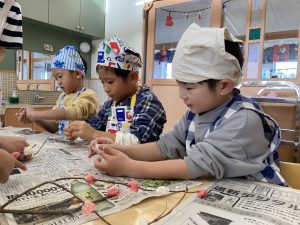 くるみ組はおもちつきの合間に“餅花作り”もしてくれましたよ。お餅をちぎって…色を付けて…とっても素敵な餅花が完成しました✨